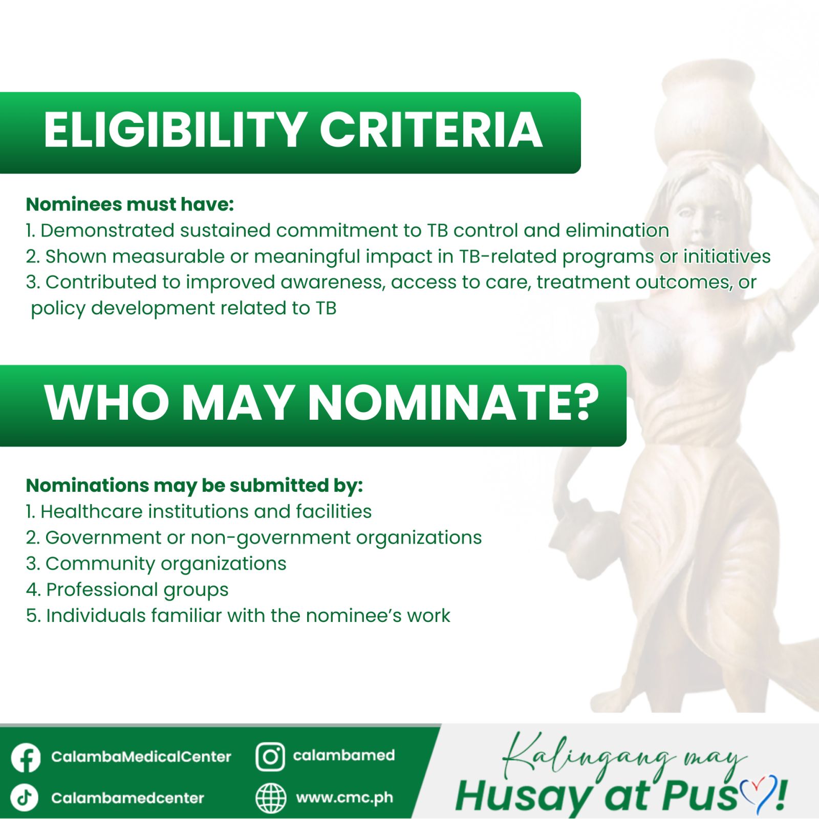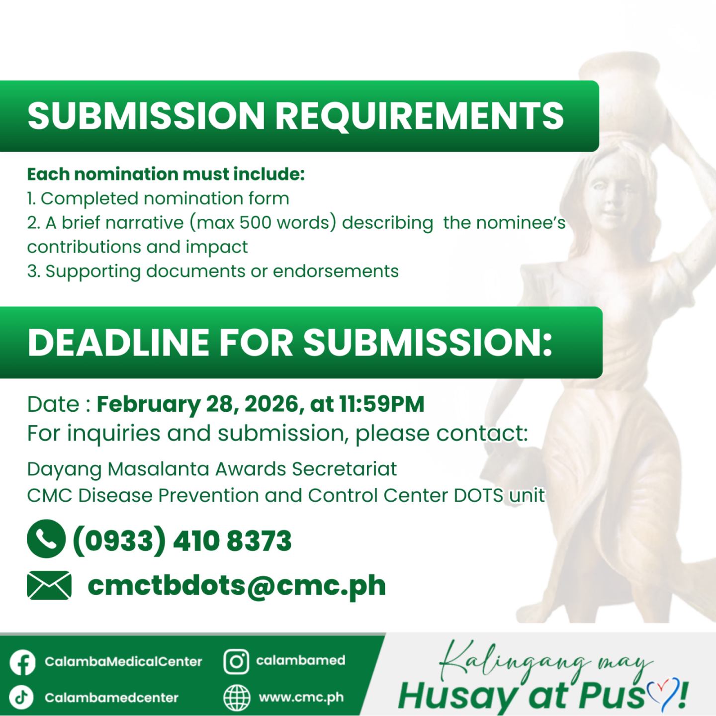 Kilalanin ang mga bayani sa laban kontra Tuberculosis. Sa ika-4 na taon ng Dayang Masalanta Awards, pinararangalan ng Calamba Medical Center ang mga healthcare professionals, community groups, at institusyon na tunay na naglilingkod at tumutulong pigilan ang pagkalat ng TB sa komunidad.