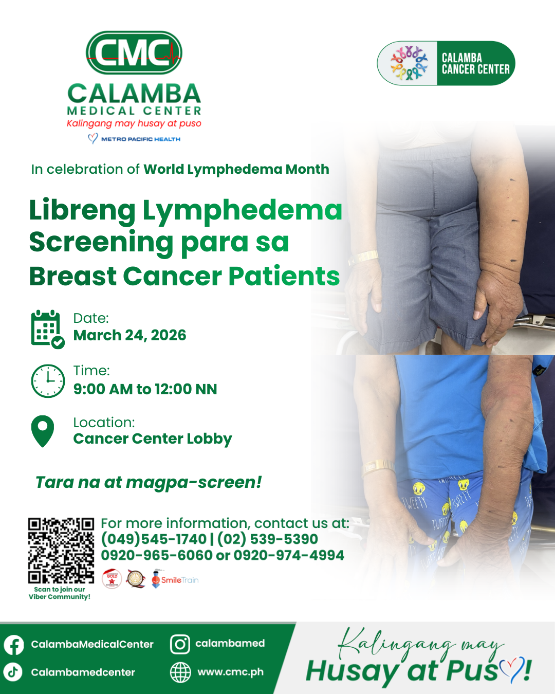 Ngayong World Lymphedema Month, handog ng Calamba Cancer Center ang libreng Lymphedema Screening para sa mga breast cancer patients.